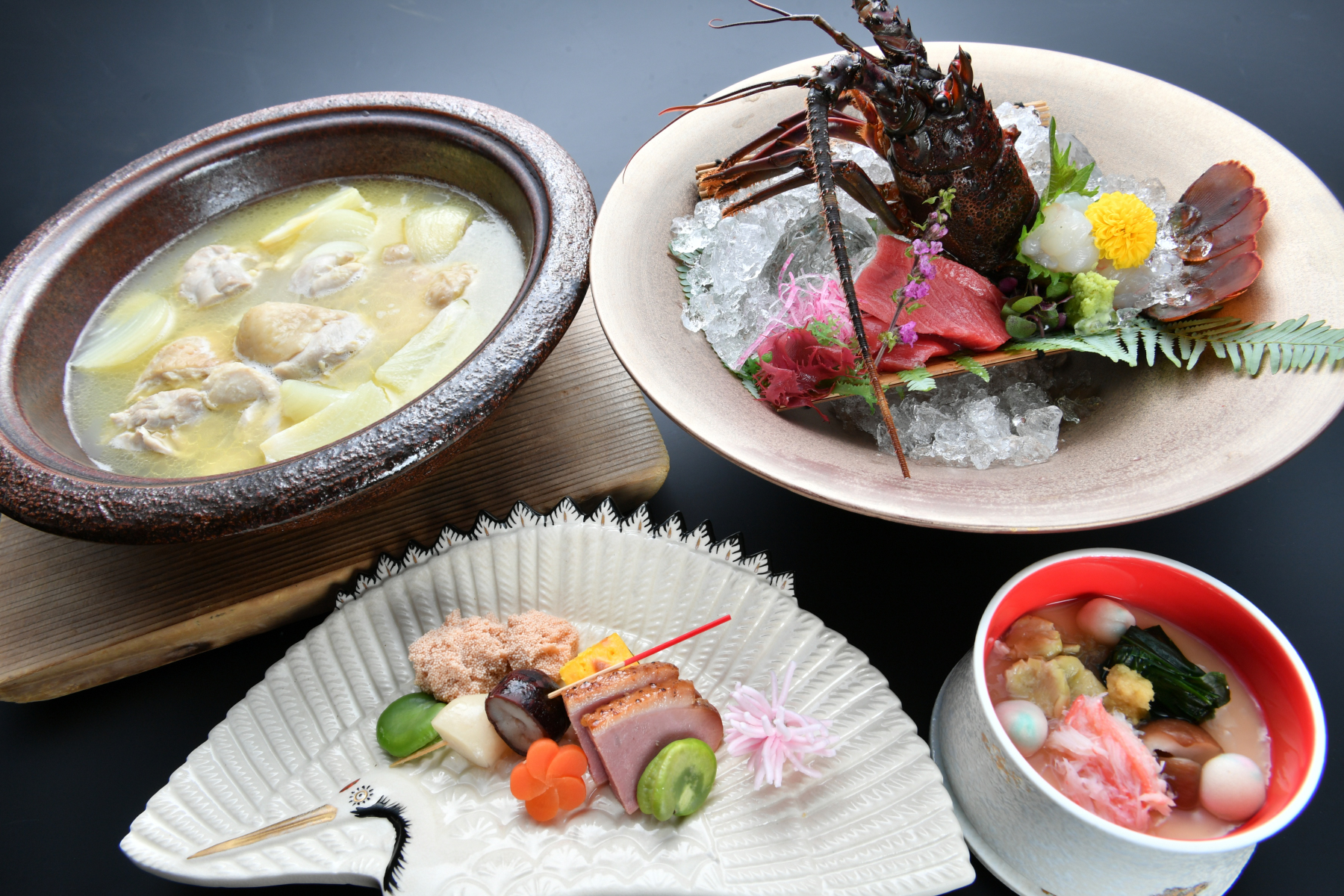 献立一例>季節の前菜盛り合わせ/伊勢海老と本鮪の二種盛り(禁漁期間は差替え)/茶碗蒸し/料理長のおすすめ/国産黒毛和牛醤油麹煮/お赤飯/甘味
