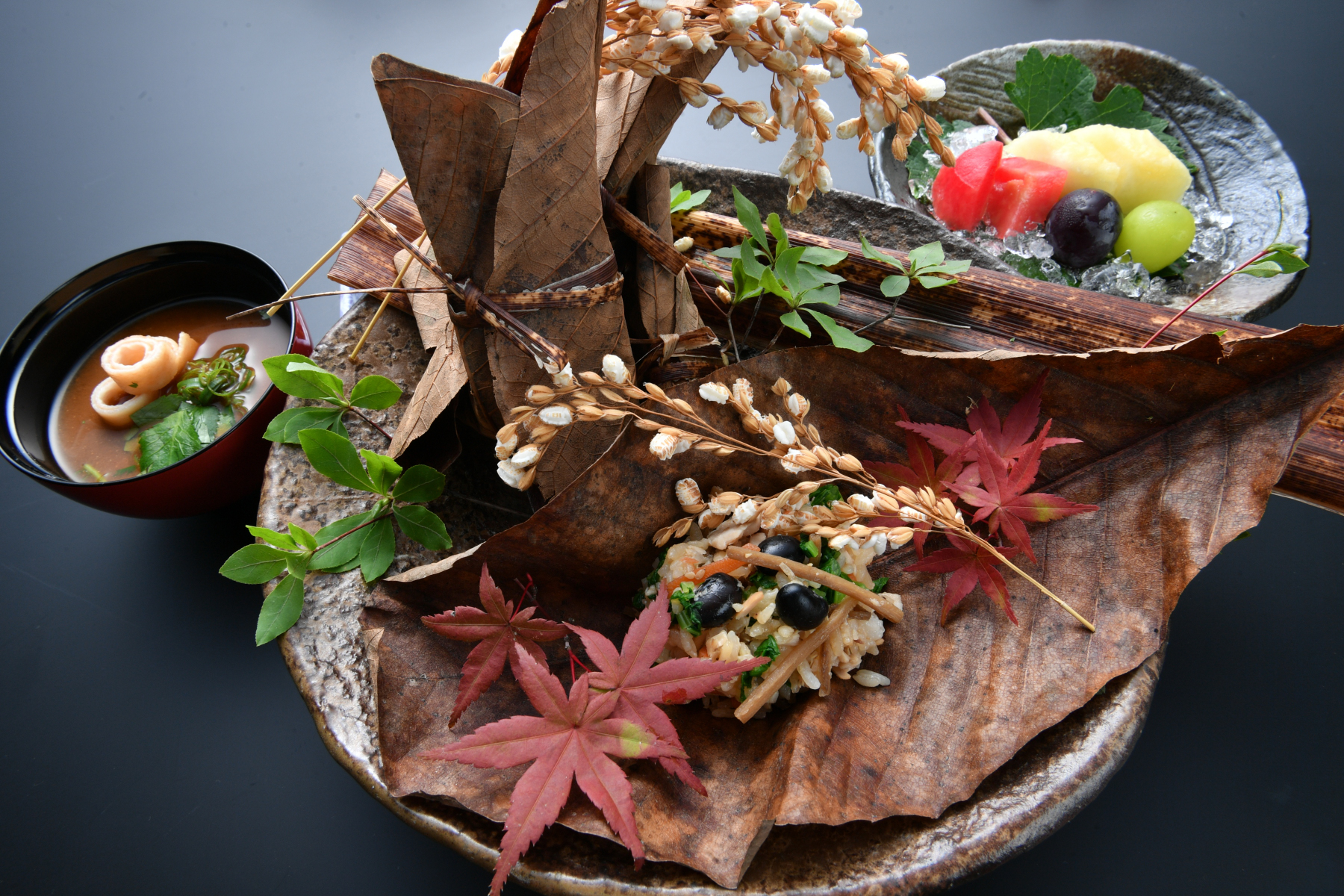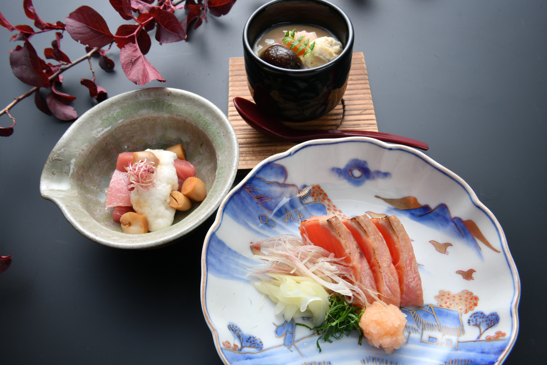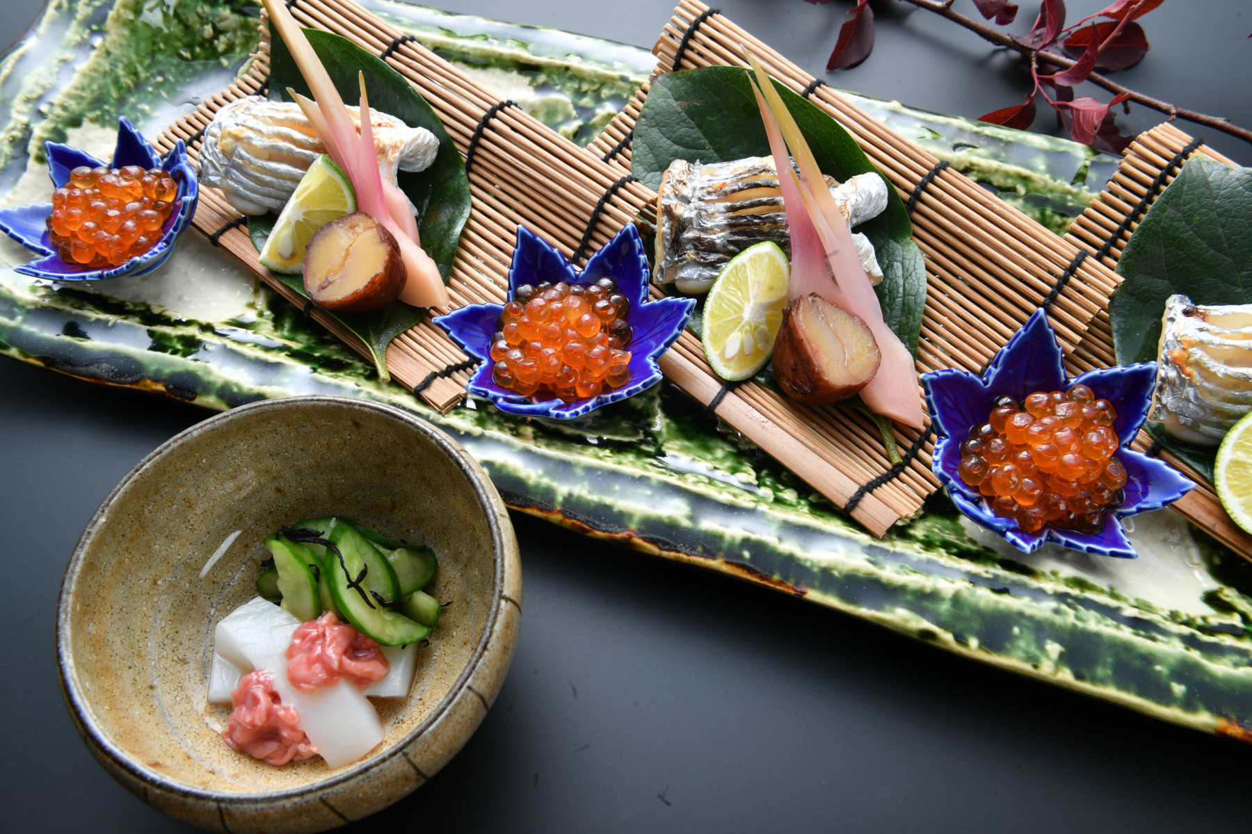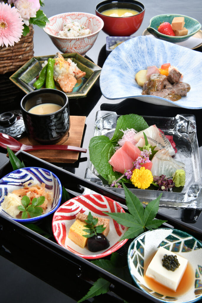 季節を感じる食材を盛り合わせた楽しい前菜にはじまり、清まし仕立ての吸い物、お造りには信州サーモンと本鮪、焼物には太刀魚、料理長おすすめの一品、進肴のあとはメインで但馬太田牛の生姜醤油麹焼、鯛のおこわを朴葉包みで、デザートには季節の果物をご用意しました。
